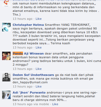 Tidak adanya itikan baik dari smartfren untuk memberikan informasi terbaru atas promo yang sudah di sebarluaskan, terbukti juga informasi yang diberikan mengenai perubahan ketentuan promo andromaxi tersebut diinformasikan melalui message facebook, bukan langsung di page dimana saya komentar, ada kesan menutupi perubahan ketentuan atas promo yang sudah ada.