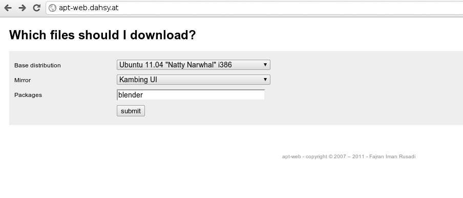 Website tersebut bernama Apt-Web yang beralamat di . Sebuah website lokal sederhana, sepertinya telah dibuat oleh Fajran Imam. Web tersebut menyediakan fasilitas search link software beserta dependensi yang dibutuhkannya. Selain itu kita bisa memilih mendownload dari mirror yang tersedia di Indonesia. Berikut tampilan awal websitenya.