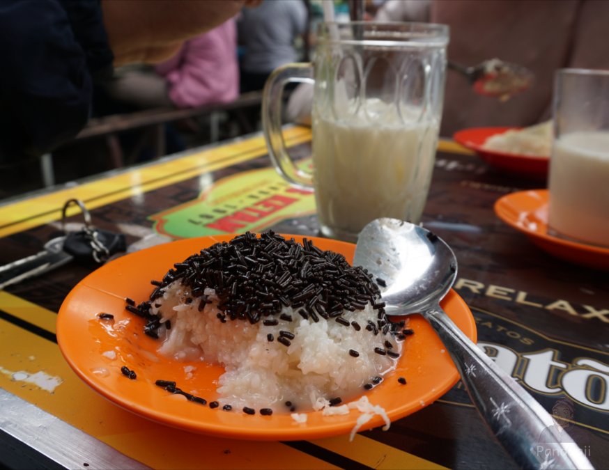 Tidak butuh waktu lama untuk menyajikan pesananku, meski suasana enggak seenak ketika malam tapi rasa penasran tentang pos ketan legenda ini sudah terbayar. Seporsi ketan dengan durian, keju dan fla tersaji menggoda di hadapanku.
