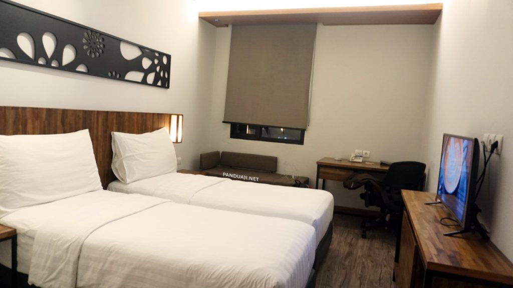Lampu kekuningan menyala begitu listrik tersambung ke dalam ruangan, sebuah televisi 32in pun menyala secara otomatis menyambut kedatangan kami, tidak lupa pula deru mesin AC yang berusaha mendinginkan kamar.