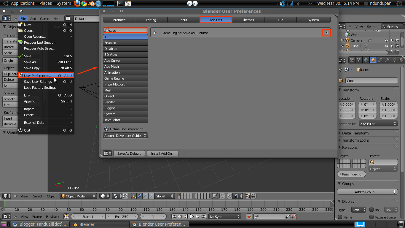 • Buka File > User Preferences > Adds On > Search Save as runtime > Aktifkan > Close